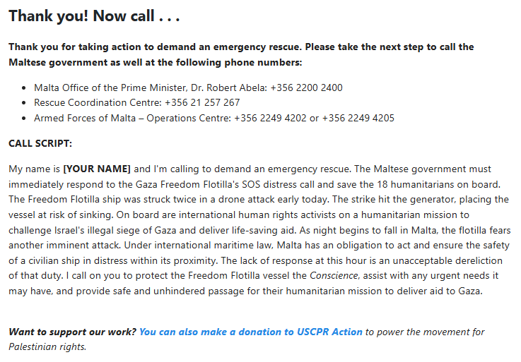 Following the attack, calls for action included demands for Malta to ensure the safety of those aboard the distressed vessel, for the international community to condemn the aggression and demand a full investigation, and for states to end political, financial, and military support for Israel’s blockade and occupation. There were also calls for accountability for war crimes and the use of nonviolent actions like Boycotts, Divestment, and Sanctions (BDS) to pressure Israel. Some also urged governments, particularly the U.S., to use their leverage to ensure aid flow and a lasting ceasefire.