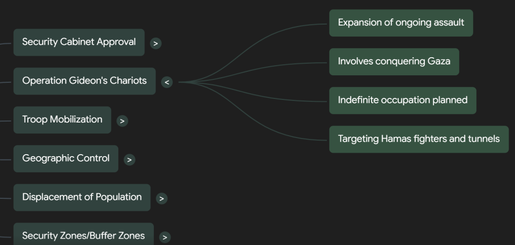 This image illustrates part of the mind map that was created for this NotebookLM project. This is the branch of the mind map related to Operation Gideon’s Chariots, which involves