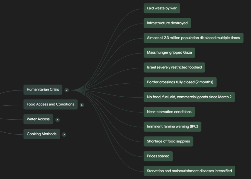 - Currently (as of Early May 2025): Mass hunger grips Gaza due to Israel’s severe restrictions on aid. The IPC is conducting another evaluation of food insecurity and acute malnutrition. Israel is creating a power vacuum in Gaza by targeting its civil government and allegedly backing armed looters. Israel has dramatically altered the map of Gaza, declaring about 70% a military “red zone” or under evacuation orders. Israel has also enlarged its “security zone” along Gaza’s borders. Israel plans to displace close to 2 million Palestinians to the Rafah area, where humanitarian aid compounds are being built. All Palestinians entering these areas will be screened. Rafah City is surrounded by corridors constructed by the Israeli army. Calls are growing among families in Gaza for clans to form a new “united leadership” to confront lawlessness.