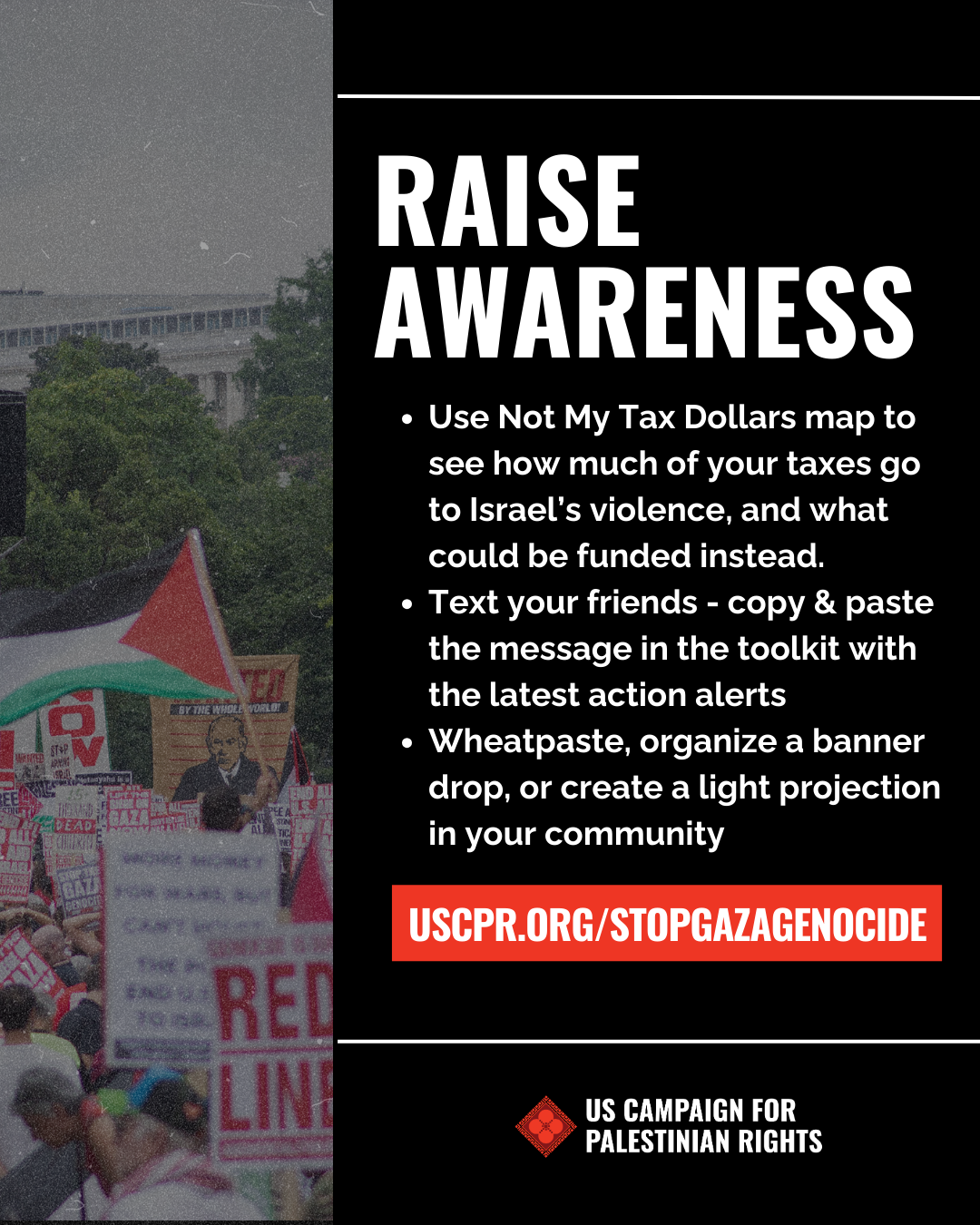- Join our weekly Action Hour to stay updated on the news in Palestine and learn more ways to get involved and take action.
