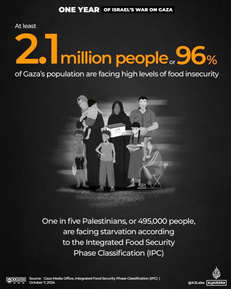 Infographic showing the distibution of food insecurity amongst the estimated 2.1 million people living in the Palestinian territory of the Gaza Strip, according to an Integrated Food Security Phase Classification (IPC) analysis on May 12, 2025© Nalini LEPETIT-CHELLA