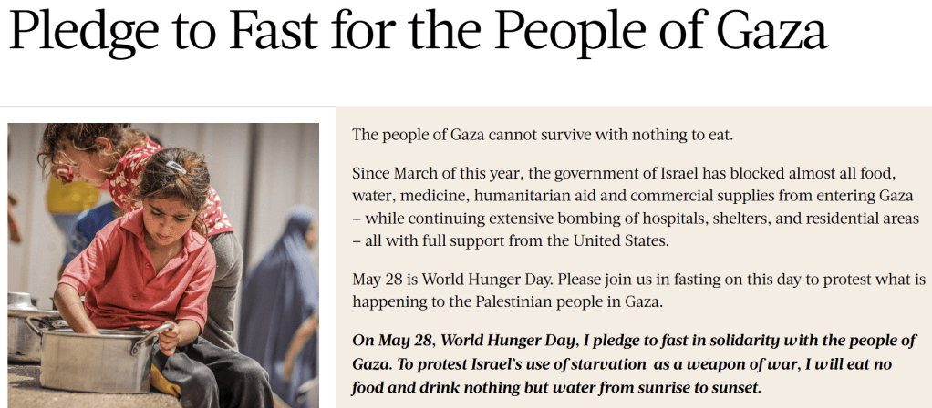 You could say: Today, on World Hunger Day, I am calling on you to join me in fasting in solidarity with the people of Gaza, who have been denied access to food for over two months by the government of Israel. To protest this, I am eating no food and drinking nothing but water from sunrise to sunset. I hope my small symbolic act encourages an end to this terrible and preventable catastrophe.