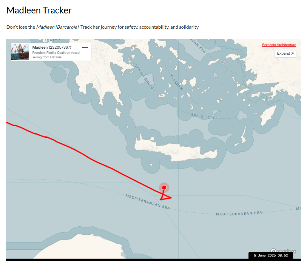 As conditions in Gaza continue to deteriorate and Israel has completely blocked aid for over two months, the Freedom Flotilla ship Madleen is currently trying to get aid to Gaza. The Madleen was attacked by Israeli drones several weeks ago, but is currently sailing again. You can track her location: https://freedomflotilla.org/ffc-tracker/