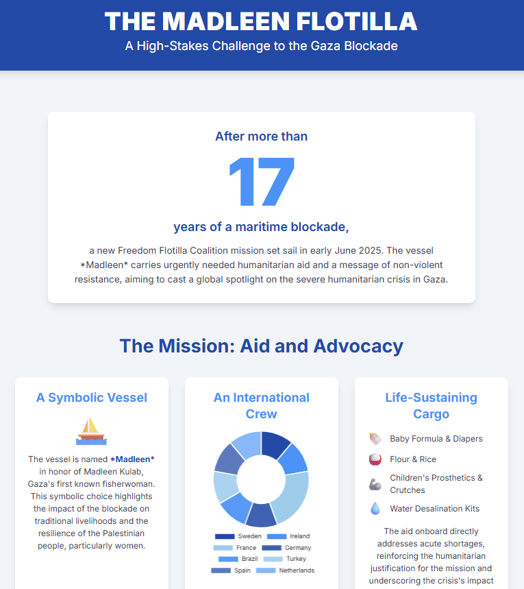 A humanitarian response I’ve been writing about is the attempt of the small Freedom Flotilla vessel, the Madleen, to break Israel’s maritime blockade, to get humanitarian aid to Gaza. (See: https://unflinching.blog/?s=madleen)
