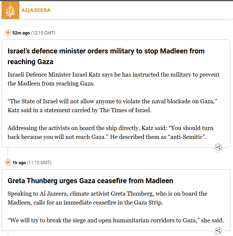 Gaza-bound aid flotilla with 12 activists on board nears Gaza coast despite Israeli warning. – ‘Israel is jamming our colleagues’ location and signal on Madleen (vessel),’ one of aid flotilla organizers says, warning Israel is preparing ‘to commit a war crime in the middle of international waters’ by Ahmed Asmar, AA, 08.06.2025