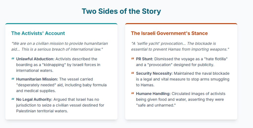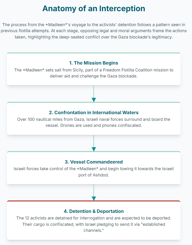 - June 9, 2025: The Israeli Defense Forces (IDF) board the Madleen and detain the 12 activists on board in international waters. The activists are subsequently transported to Israel.