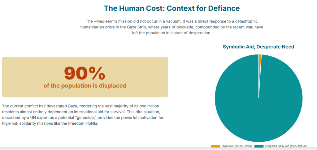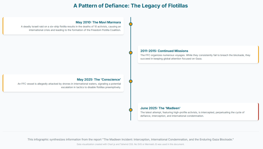 - June 1, 2025: The ship Madleen departs from Catania, Sicily, with Gaza as its destination, carrying urgent supplies and activists, including Greta Thunberg. The mission is organized by the Freedom Flotilla Coalition.