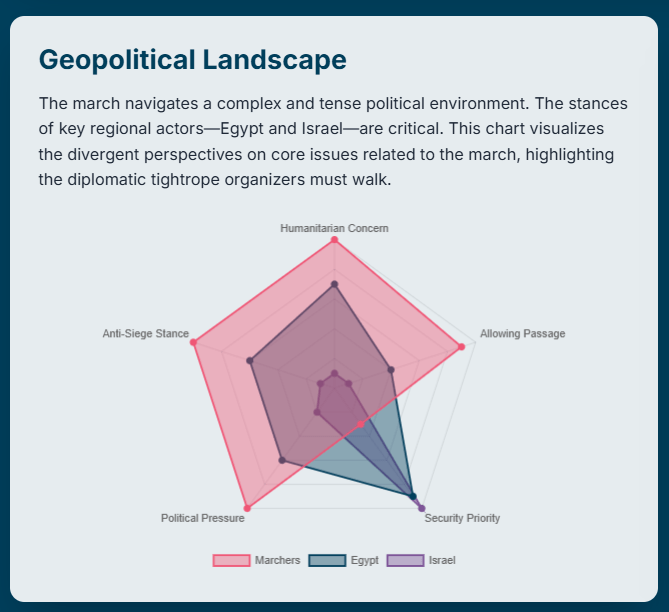 - The Global Marchers plan a short stay in Rafah, contingent on authorizations from the Egyptian government, aiming to negotiate the opening of the Rafah terminal.