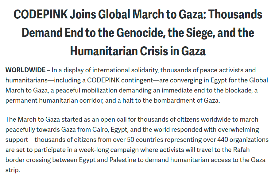 - CODEPINK issues a press release announcing its participation in the Global March to Gaza.