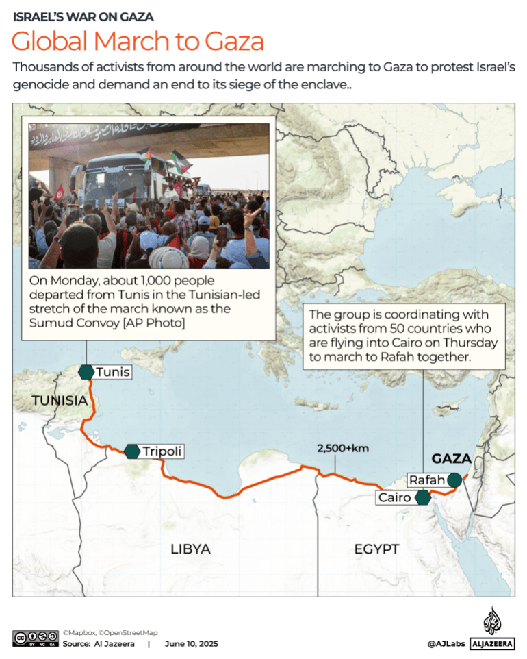 - Over 10,000 participants from 32 countries begin the Global March to Gaza.