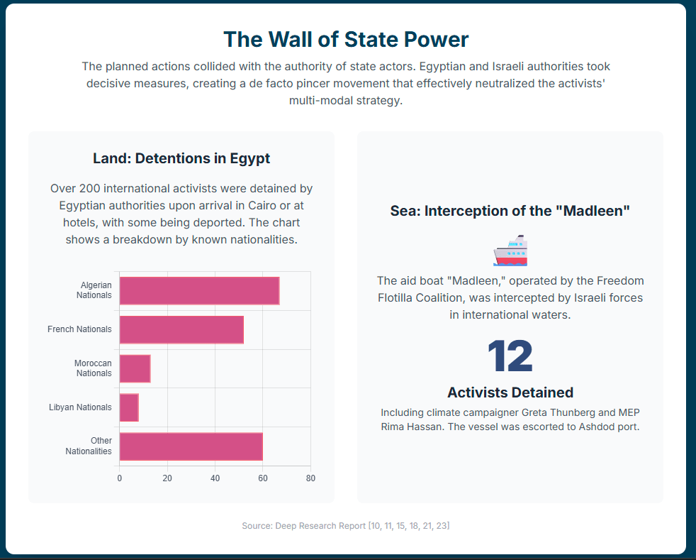 - Cairo authorities reportedly detain and deport dozens of foreign nationals entering Egypt for the Global March to Gaza.