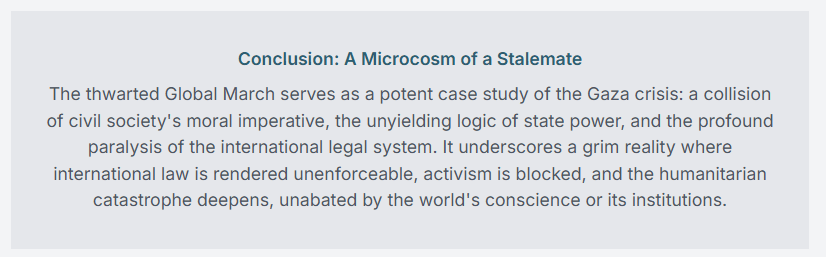 Egypt’s handling of the situation, officially framed as a necessary safeguard for national security in the volatile Sinai region, was shaped by complex pressures and a deeply entrenched strategic objective—to prevent the large-scale displacement of Palestinians. Caught in an impossible position, Cairo faced mounting Israeli and Western demands to halt the demonstration, while also bracing for domestic and international backlash over suppressing a peaceful, humanitarian-driven movement. The preemptive dismantling of the march was a calculated move, designed to avert a symbolic and political standoff at the Rafah border that could have undermined Egypt’s official stance and forced an unavoidable confrontation.