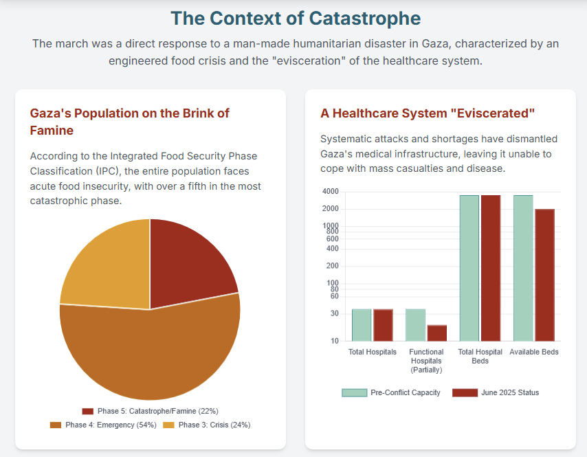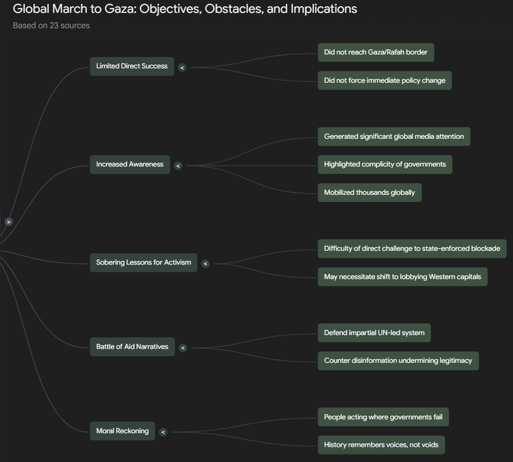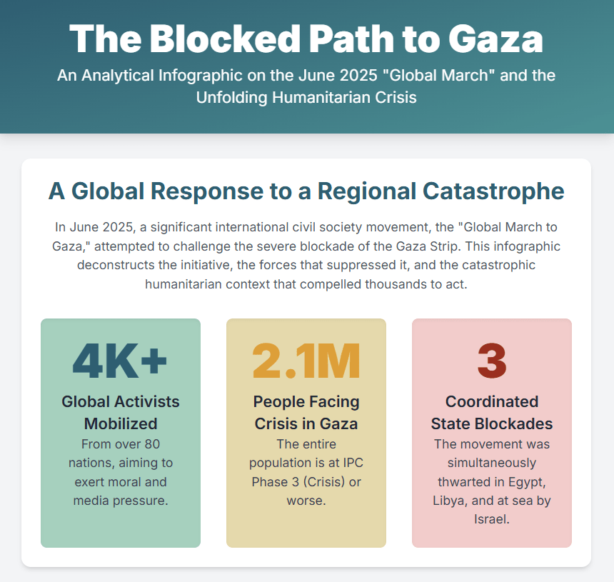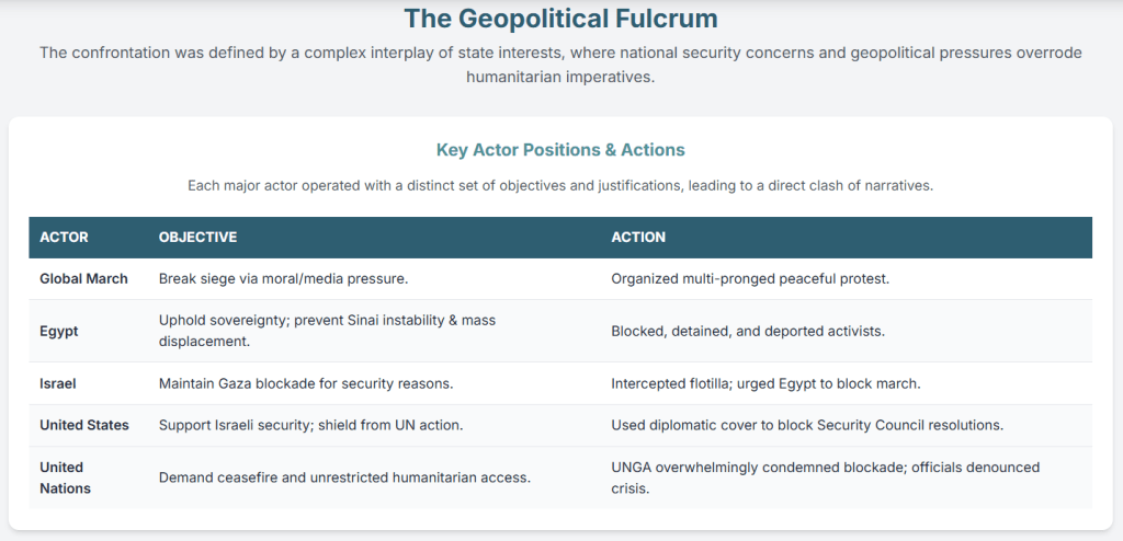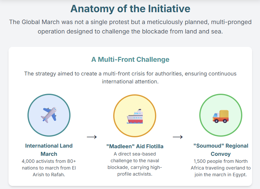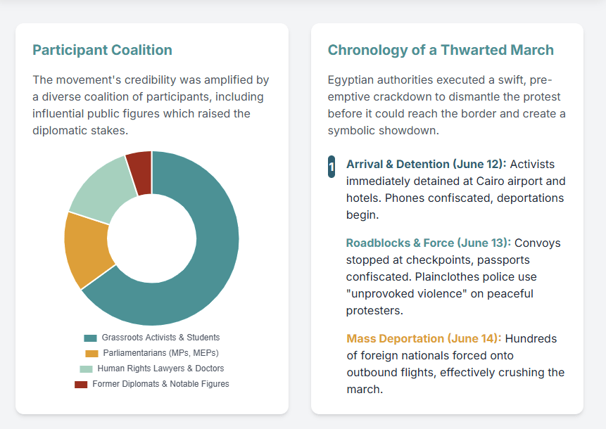 | Global March Organizers | To create “moral and media pressure” to break the siege on Gaza and allow humanitarian aid. 1 | Organized a multi-pronged protest involving a land march, a sea flotilla, and a regional convoy. 3 | “We are a peaceful movement and we are complying with Egyptian law.” 6 |