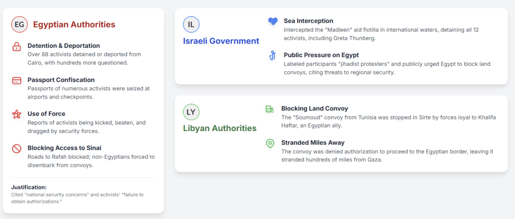 | Israel | To prevent any breach of its naval and land blockade of Gaza, which it claims is for security purposes. 7 | Intercepted the “Madleen” aid flotilla at sea; detained and deported activists; publicly called on Egypt to stop the land march. 2 | Labeled protesters as “jihadists” who “endanger the Egyptian regime and constitute a threat to all moderate Arab regimes.” 1 |