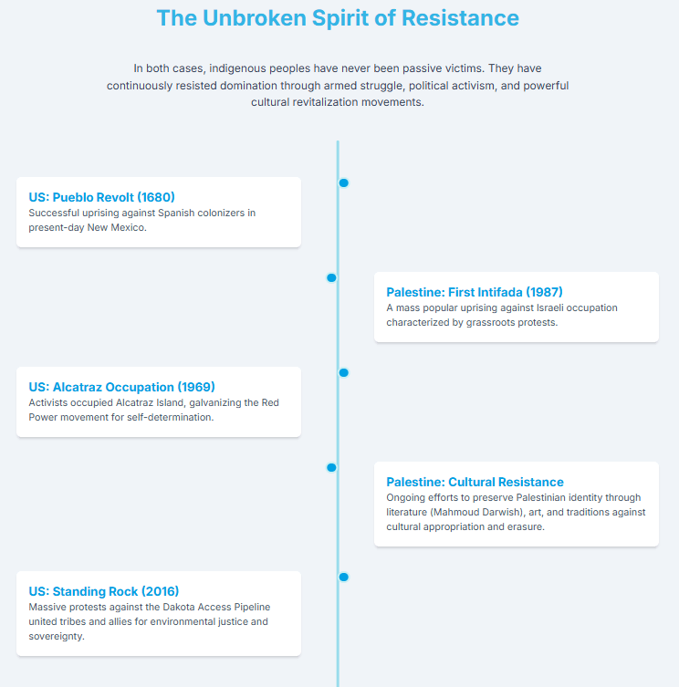 | Legal & Political Subjugation | Plenary Power & Broken Treaties: The U.S. government granted itself “plenary power” over Native affairs, systematically breaking over 500 treaties. Native Americans were not granted U.S. citizenship until 1924 and remain subject to a complex and often contradictory legal system. | Military Law & Unequal Rights: Palestinians in the occupied West Bank are subject to Israeli military law, while Jewish settlers living in the same territory are subject to Israeli civil law. This creates a two-tiered system of justice. | The blatant inequality of a dual legal system in the West Bank helps Americans question the myth of “equal justice for all” in their own history, prompting a closer look at how U.S. law has been historically applied to dispossess and control Native Americans. |