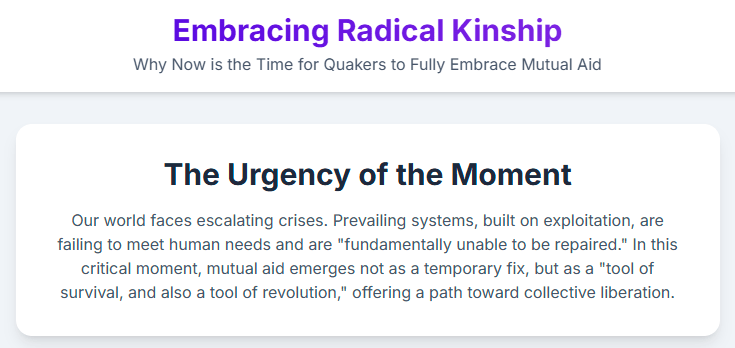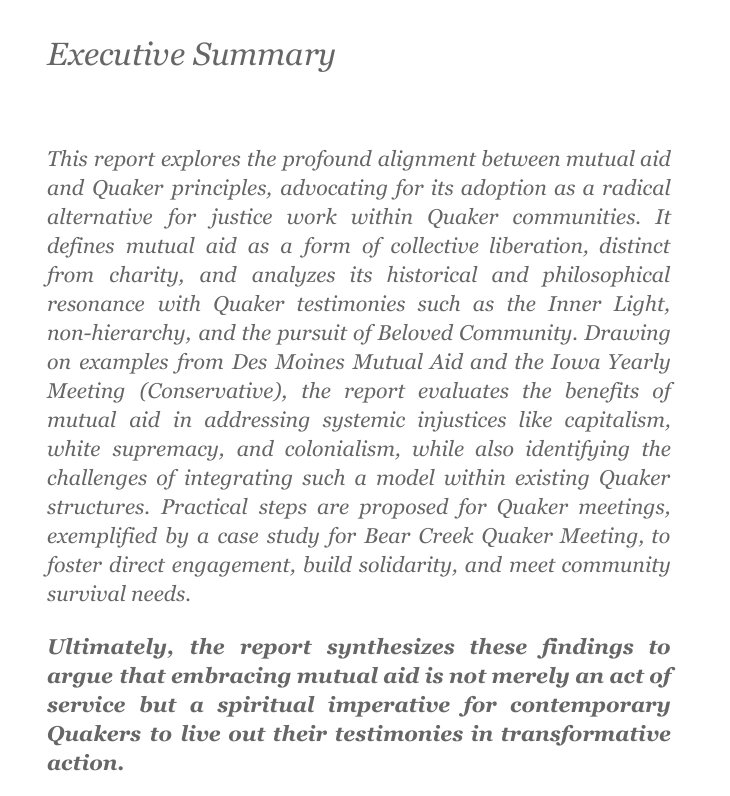 I’ve been blessed to have been part of the Des Moines Mutual Aid community for years, and that has profoundly changed how I see systems of injustice and the reasons I’ve been led to fully embrace mutual aid to build Beloved community as the way forward. I’m nearly finished writing an electronic book that goes into great detail about why and how Quakers should embrace mutual aid. If you have an interest in this, let me know (jakislin@outlook.com)