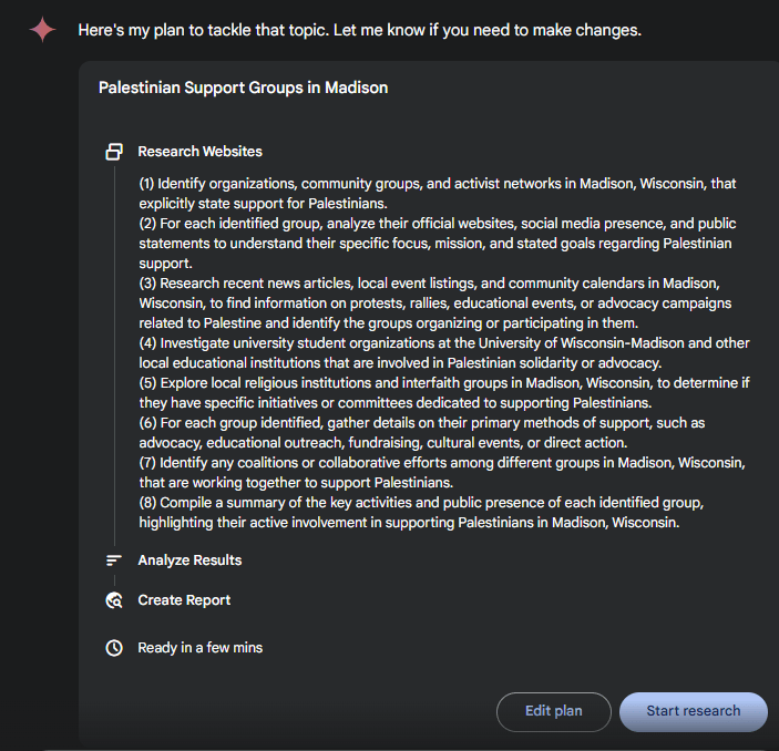 To illustrate the process, I’m going to show you the transcript that Gemini displays as it researches my prompt, “Create a report that identifies groups that are actively supporting Palestinians in Madison Wisconsin.”