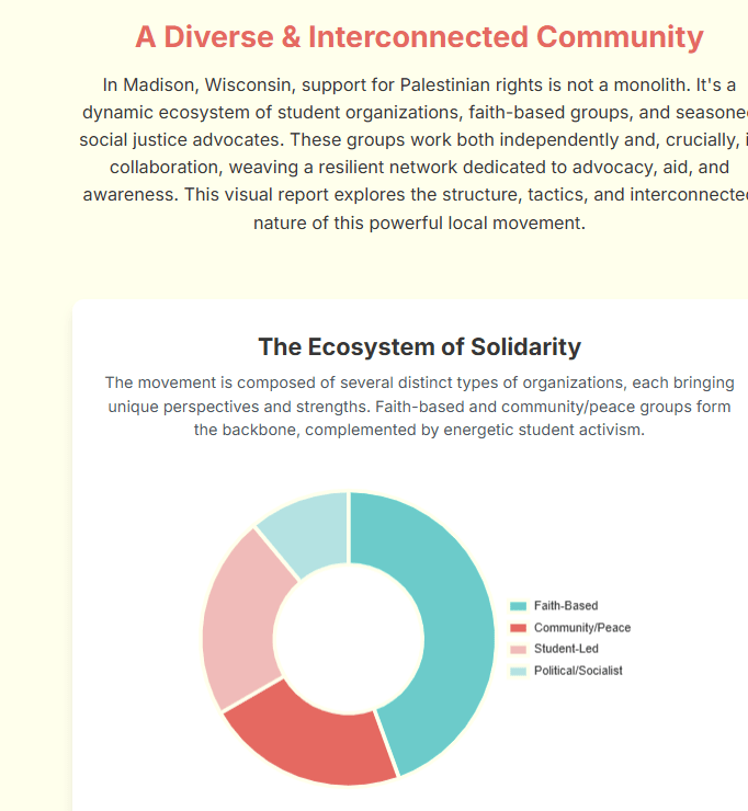 One of the other great features of Gemini is the creation of Infographics, a visualization of the information that has been generated from the completed document, in this case the document above, “Palestinian Solidarity Groups in Madison, Wisconsin: An Overview of Active Organizations and Initiatives.” I’m really excited about this tool, because I believe most people would prefer a simplified summary of a large amount of text.