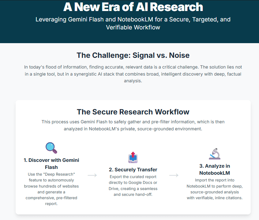 The document included here delineates how Google Gemini Flash, with its advanced Deep Research capabilities, serves as an optimal tool for securely and precisely gathering a targeted set of resources, which can then be seamlessly integrated into Google NotebookLM for grounded, verifiable analysis. By combining Flash’s intelligent information retrieval and pre-filtering with NotebookLM’s source-grounded AI and robust privacy features, users can achieve unparalleled efficiency and accuracy in their research workflows, mitigating common AI risks such as hallucination and data misuse. This integrated approach represents a significant advancement in AI-powered research, offering a secure and highly productive environment for professionals across various domains.